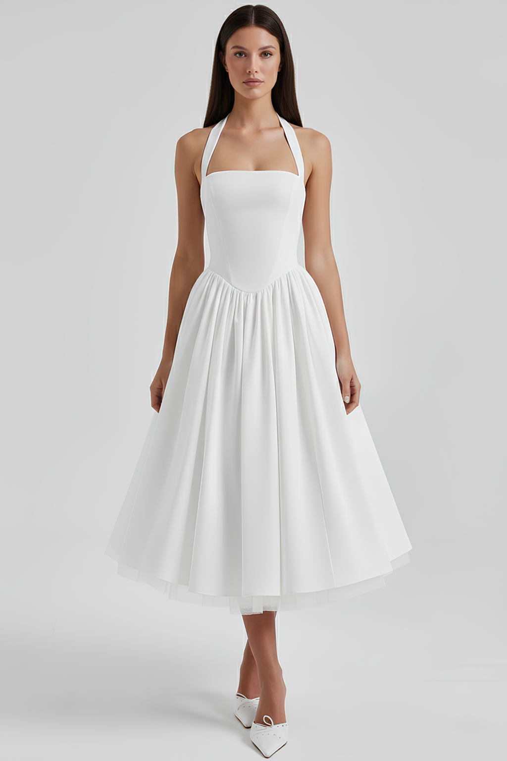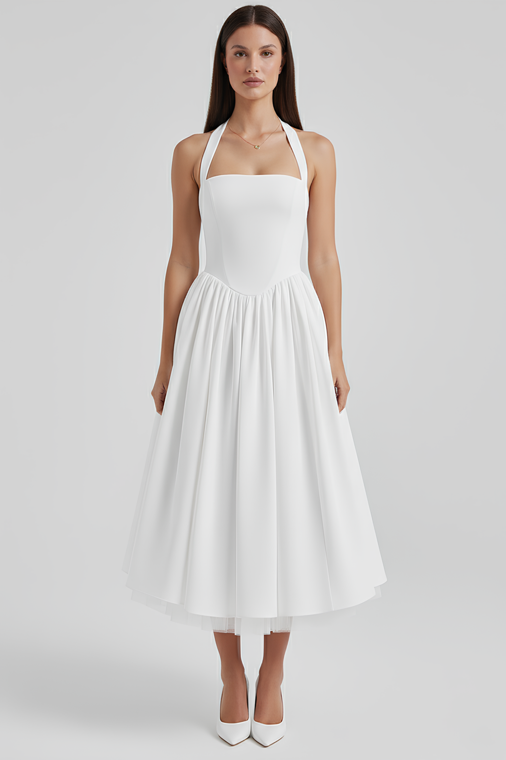 Vestido Midi Modelador Anabel traz elegância com seu caimento leve e fluido. Com ajuste na cintura, modelagem frontal e um detalhe na nuca que faz uma verdadeira diferença.